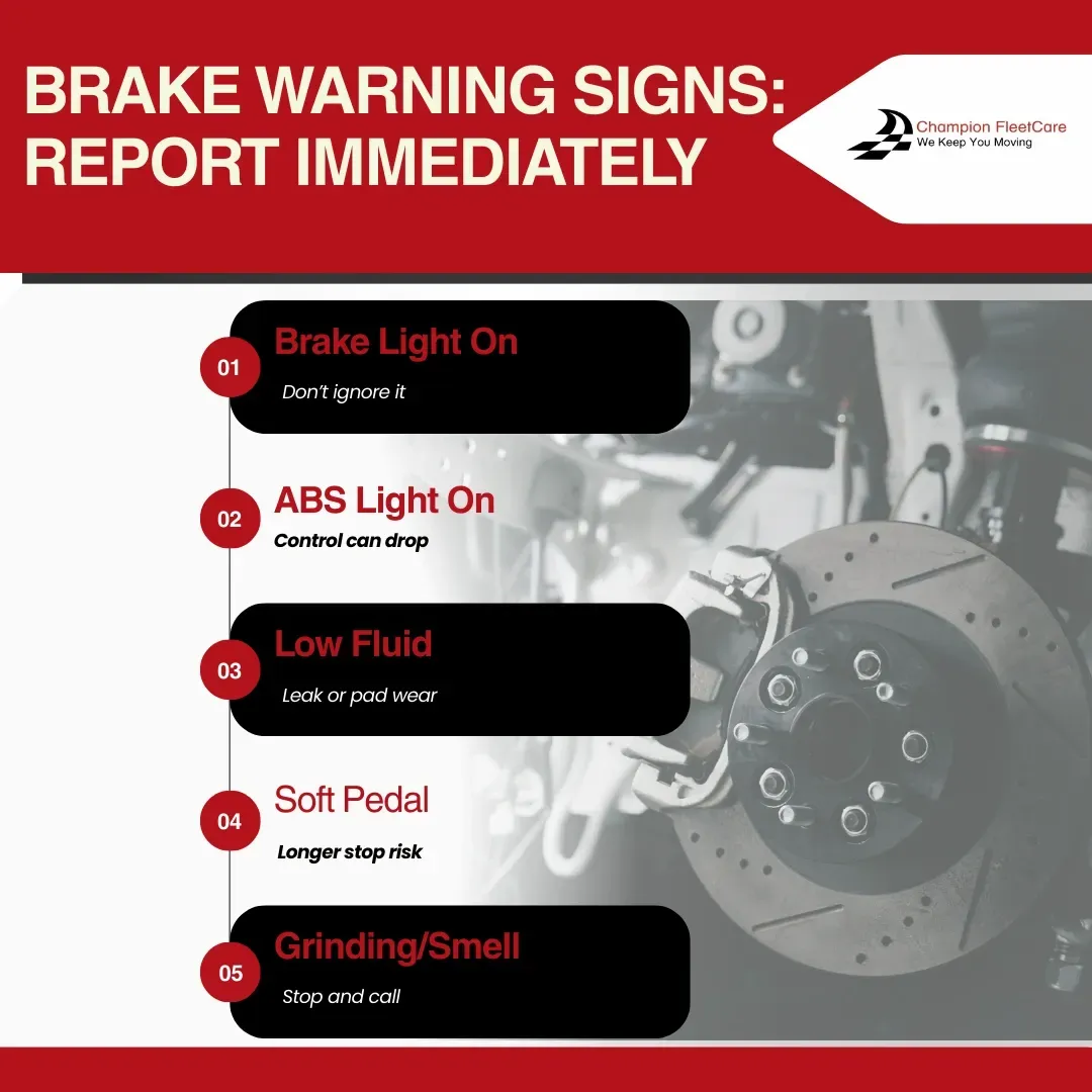 Don't wait for warning signs to escalate; proactive maintenance is key to fleet safety. Trust Champion Fleet to keep your brakes in top condition, so you can focus on what matters—keeping your operations running smoothly.